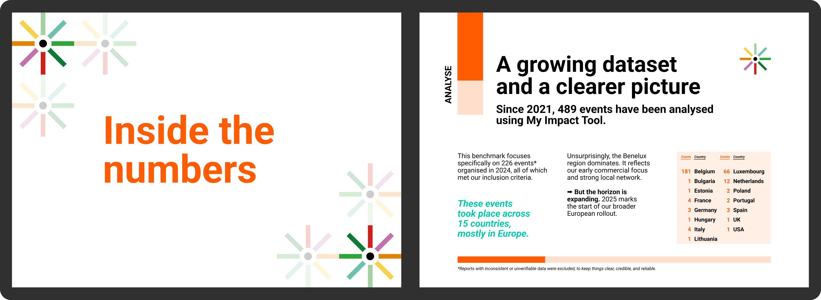 Support in visual design and information structuring for the My Impact Tool Benchmark, a platform designed to evaluate the environmental and social impact of events and communication campaigns.The challenge was to organize complex datasets into a clear and visual presentation.